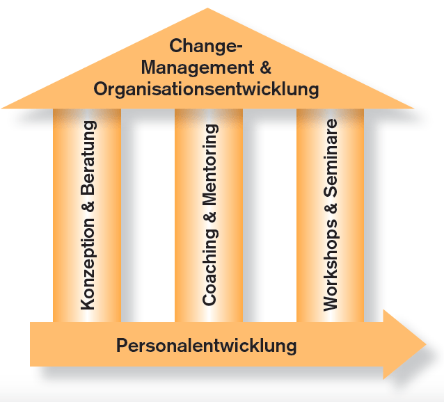 In order to optimally support our customers in questions of change management, personnel and organizational development, we rely on an action model that is based on three pillars: consulting, coaching and workshops.
